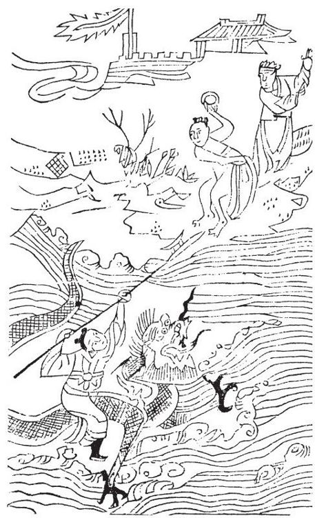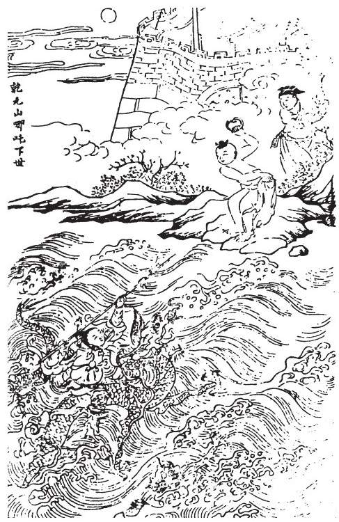 话说哪吒同家将出关,约行一里之余,天热难行。哪吒走得汗流满面,乃叫家将:“看前面树荫之下,可好纳凉?”家将来到绿柳荫中,只见熏风荡荡,烦襟尽解,急忙走回来,对哪吒禀曰:“禀公子,前面柳荫之内,甚是清凉,可以避暑。”哪吒听说,不觉大喜,便走进林内,解开衣带,舒放襟怀,甚是快乐。猛忽的见那壁厢清波滚滚,绿水滔滔,真是两岸垂杨风习习,崖傍乱石水潺潺。哪吒立起身来,走到河边,叫家将:“我方才走出关来,热极了,一身是汗,如今且在石上洗一个澡。”家将曰:“公子仔细,只怕老爷回来,可早些回去。”哪吒曰:“不妨。”脱了衣裳,坐在石上,把七尺混天绫放在水里,蘸水洗澡。不知这河是九湾河,乃东海口上。哪吒将此宝放在水中,把水俱映红了。摆一摆,江河晃动;摇一摇,乾坤动撼。那哪吒洗澡,不觉那水晶宫已晃的乱响。不说那哪吒洗澡,且说东海敖光在水晶宫坐,只听得宫阙震响,敖光忙唤左右,问曰:“地不该震,为何宫殿晃摇?”传与巡海夜叉李艮,看海口是何物作怪。夜叉来到九湾河一望,见水俱是红的,光华灿烂,只见一小儿将红罗帕蘸水洗澡。夜叉分水,大叫曰:“那孩子将甚么作怪东西,把河水映红,宫殿摇动?”哪吒回头一看,见水底一物,面如蓝靛,发似朱砂,巨口獠牙,手持大斧。哪吒曰:“你那畜生,是个甚东西,也说话?”夜叉大怒,“吾奉主公点差巡海夜叉,怎骂我是畜生?”分水一跃,跳上岸来,望哪吒顶上一斧劈来。哪吒正赤身站立,见夜叉来得勇猛,将身一躲过,把右手套的乾坤圈望空中一举。此宝原系昆仑山玉虚宫所赐太乙真人镇金光洞之物,夜叉那里经得起,那宝打将下来,正落在夜叉头上,只打的脑浆迸流,即死于岸上。哪吒笑曰:“把我的乾坤圈都污了。”复到石上坐下,洗那圈子。水晶宫如何经得起此二宝震撼,险些儿把宫殿俱晃倒了。敖光曰:“夜叉去探事未回,怎的这等凶恶!”正说话间,只见龙兵来报:“夜叉李艮被一孩童打死在陆地,特启龙君知道。”敖光大惊:“李艮乃灵霄殿御笔点差的,谁敢打死?”敖光传令:“点龙兵,待吾亲去,看是何人!”话未了,只见龙王三太子敖丙出来,口称:“父王,为何大怒?”敖光将李艮打死的事说了一遍。三太子曰:“父王请安。孩儿出去拿来便是。”忙调龙兵,上了逼水兽,提画杆戟,径出水晶宫来。分开水势,浪如山倒,波涛横生,平地水长数尺。哪吒起身看着水,言曰:“好大水!好大水!”只见波浪中现一水兽,兽上坐一人,全装服色,持戟骁雄,大叫曰:“是甚人打死我巡海夜叉李艮?”哪吒曰:“是我。”敖丙一见,问曰:“你是谁人?”哪吒答曰:“我乃陈塘关李靖第三子哪吒是也。俺父亲镇守此间,乃一镇之主。我在此避暑洗澡,与他无干,他来骂我,我打死了他,也无妨。”三太子敖丙大惊曰:“好泼贼!夜叉李艮乃天王殿差,你敢大胆将他打死,尚敢撒泼乱言!”太子将画戟便刺,来取哪吒。哪吒手无寸铁,把手一低,攒将过去,“少待动手,你是何人?通个姓名,我有道理。”敖丙曰:“孤乃东海龙君三太子敖丙是也。”哪吒笑曰:“你原来是敖光之子。你妄自尊大,若恼了我,连你那老泥鳅都拿出来,把皮也剥了他的。”三太子大叫一声:“气杀我!好泼贼!这等无礼!”又一戟刺来。哪吒急了,把七尺混天绫望空一展,似火块千团,往下一裹,将三太子裹下逼水兽来。哪吒抢一步赶上去,一脚踏住敖丙的颈项,提起乾坤圈,照顶门一下,把三太子的元身打出,是一条龙,在地上挺直,哪吒曰:“打出这小龙的本像来了,也罢,把他的筋抽去,做一条龙筋绦与俺父亲束甲。”哪吒把三太子的筋抽了,径带进关来。把家将吓得浑身骨软筋酥,腿慢难行,挨到帅府门前。哪吒来见母夫人。夫人曰:“我儿,你往那里耍子,便去这半日?”哪吒曰:“关外闲行,不觉来迟。”哪吒说罢,往后园去了。