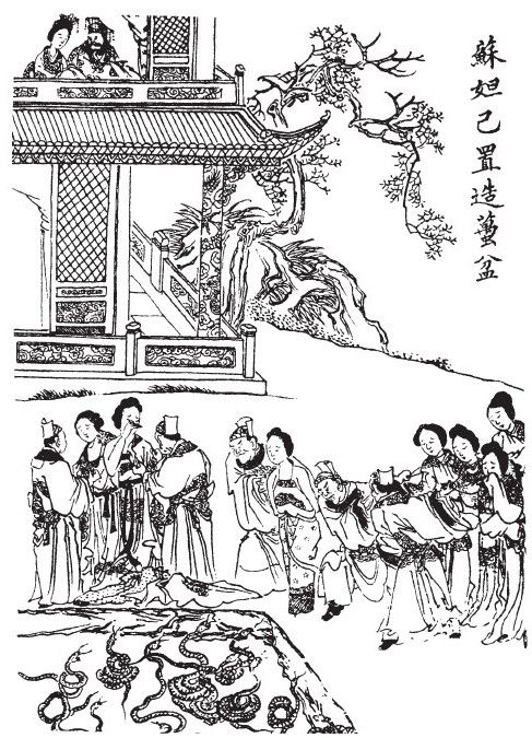 且说妲己把玉石琵琶放于摘星楼上,采天地之灵气,受日月之精华,已后五年,返本还元,断送成汤天下。一日,纣王在摘星楼与妲己饮宴,酒至半酣,妲己歌舞一回,与纣王作乐。三宫嫔妃,六院宫人,齐声喝采。内有七十余名宫人,俱不喝采,眼下且有泪痕。妲己看见,停住歌舞,查问那七十余名宫人,原是那一宫的。内有奉御官查得:原是中宫姜娘娘侍御宫人。妲己怒曰:“你主母谋逆赐死,你们反怀忿怒,久后必成宫闱之患。”奏与纣王,纣王大怒,传旨:“拿下楼,俱用金瓜打死!”妲己奏曰:“陛下,且不必将这起逆党击顶,暂且送下冷宫,妾有一计,可除宫中大弊。”奉御官即将宫女送下冷宫。且说妲己奏纣王曰:“将摘星楼下,方圆开二十四丈阔,深五丈。陛下传旨,命都城万民,每一户纳蛇四条,都放于此坑之内,将作弊宫人,跣剥干净,送下坑中,喂此毒蛇。此刑名曰‘虿盆’。”纣王曰:“御妻之奇法,真可剔除宫中大弊。”天子随传旨意,张挂各门。国法森严,万民遭累,勒令限期,往龙德殿交蛇。众民日日进于朝中,并无内外,法纪全消。朝廷失政,不止一日。众民纳蛇,都城那里有这些蛇,俱到外县买蛇交纳。
