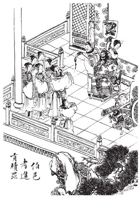 奉御官启奏:“亚相比干见驾。”纣王曰:“宣比干上楼。”比干上楼朝见。王曰:“朕无旨宣召。卿有何表章?”比干奏曰:“臣启陛下:西伯侯姬昌子伯邑考,纳贡代父赎罪。”王曰:“伯邑考纳进何物?”比干将进贡本呈上。帝览毕,向比干曰:“七香车,醒酒毡,白面猿猴,美女十名代西伯侯赎罪。”纣王命宣邑考上楼。邑考肘膝而行,俯伏奏曰:“犯臣子伯邑考朝见。”纣王曰:“姬昌罪大忤君,今子纳贡为父赎罪,亦可为孝矣。”伯邑考奏曰:“犯臣姬昌罪犯忤君,赦宥免死,暂居羑里,臣等举室感陛下天高海阔之洪恩,仰地厚山高之大德。今臣等不揣愚陋,昧死上陈,请代父罪。倘荷仁慈,赐以再生,得赦归国,使臣母子等骨肉重完,臣等万载瞻仰陛下好生之德出于意外也。”纣王见邑考悲惨,为父陈冤,极其恳至,知是忠臣孝子之言,不胜感动,乃赐邑考平身。邑考谢恩,立于栏杆之外。妲己在帘内,见邑考丰姿都雅,目秀眉清,唇红齿白,言语温柔。妲己传旨:“卷去珠帘。”左右宫人将珠帘高卷,搭上金钩。纣王见妲己出来,即称:“御妻,今有西伯侯之子伯邑考纳贡代父赎罪,情实可矜。”妲己奏曰:“妾闻西岐伯邑考善能鼓琴,真世上无双,人间绝少。”纣王曰:“御妻何以知之?”妲己曰:“妾虽女流,幼在深闺闻父母传说,邑考博通音律,鼓琴更精,深知大雅遗音,妾所以得知。陛下可着邑考抚弹一曲,便知深浅。”纣王乃酒色之徒,久被妖氛所惑,一听其言,便命伯邑考叩见妲己。邑考朝拜毕。妲己曰:“伯邑考,闻你善能鼓琴,你今试抚一曲何如?”邑考奏曰:“娘娘在上:臣闻父母有疾,为人子者,不敢舒衣安食。今犯臣父七载羁囚,苦楚万状,臣何忍蔑视其父,自为喜悦而鼓琴哉!况臣心碎如麻,安能宫商节奏,有辱圣聪。”纣王曰:“邑考,你当此景,抚操一曲,如果稀奇,赦你父子归国。”邑考听见此言,大喜谢恩。纣王传旨,取琴一张。邑考盘膝坐在地上,将琴放在膝上,十指尖尖,拨动琴弦,抚弄一曲,名曰“风入松”:
