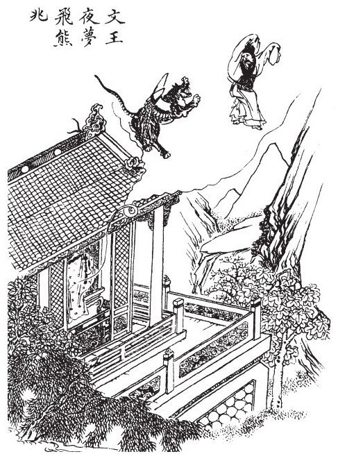 文王因在灵台看挖沼池,不觉天色渐晚,回驾不及。文王随文武在灵台上设宴,君臣共乐。席散之后,文武在台下安歇。文王台上设绣榻而寝。时至三更,正值梦中,忽见东南一只白额猛虎,胁生双翼,望帐中扑来。文王急叫左右,只听台后一声响喨,火光冲霄,文王惊醒,吓了一身香汗,听台下已打三更。文王自思:“此梦主何凶吉?待到天明,再作商议。”有诗曰: