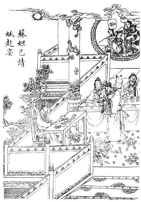 且说纣王次日传旨:“打点筵宴,安排台上,三十九席俱朝上摆列,十三席一层,摆列三层。”纣王分付,布列停妥。纣王恨不得将太阳速送西山,皎月忙升东土。九月十五日抵暮,比干朝服往台下候旨。且说纣王见日已西沉,月光东上,纣王大喜,如得万斛珠玉一般,携妲己于台上,看九龙筵席,真乃是烹龙炮凤珍羞味,酒海肴山色色新。席已完备,纣王、妲己入内坐欢饮,候神仙前来。妲己奏曰:“但群仙至此,陛下不可出见。如泄天机,恐后诸仙不肯再降。”王曰:“御妻之言是也。”话犹未了,将近一更时分,只听得四下里风响。怎见得,有诗为证。诗曰: