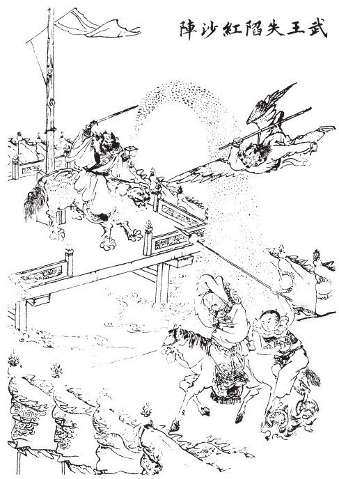 且说张天君开了“红沙阵”,里面连催钟响,燃灯听见,谓子牙曰:“此‘红沙阵’乃一大恶阵,必须要一福人方保无虞。若无福人去破此阵,必须大损。”子牙曰:“老师用谁为福人?”燃灯曰:“若破‘红沙阵’,须是当今圣主方可。若是别人,凶多吉少。”子牙曰:“当今天子体先王仁德,不善武事,怎破得此阵?”燃灯曰:“事不宜迟,速请武王,吾自有处。”子牙着武吉请武王。少时,武王至篷下,子牙迎迓上篷。武王见众道人下拜,众道人答礼相还。武王曰:“列位老师相招,有何分付?”燃灯曰:“方今十阵已破九阵,止得一‘红沙阵’,须得至尊亲破,方保无虞,但不知贤王可肯去否?”武王曰:“列位道长此来,俱为西土祸乱不安,而发此恻隐。今日用孤,安敢不去?”燃灯大喜,“请王解带,宽袍。”武王依其言,摘带,脱袍。燃灯用中指在武王前后胸中用符印一道,完毕,请武王穿袍,又将一符印塞在武王蟠龙冠内。燃灯又命哪吒、雷震子保武王下篷。只见“红沙阵”内有位道人,戴鱼尾冠,面如冻绿,颔下赤髯,提两口剑,作歌而来。歌曰: