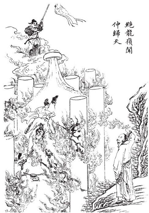 话说闻太师行至绝龙岭,方欲进岭,见山势险峻,心下甚是疑惑。猛抬头,见一道人穿水合道服,认的是终南山玉柱洞云中子。闻太师慌忙上前问曰:“道兄在此何干?”云中子曰:“贫道奉燃灯命,在此候兄多时。此处是绝龙岭,你逢绝地,何不归降?”闻太师大笑曰:“云中子,你把我闻仲当作稚子婴儿,怎言吾逢绝地,以此欺吾。你我莫非五行之术,在道通知。你今如此戏我,看你有何法治我!”云中子曰:“你敢到这个所在来?”太师就行。云中子用手发雷,平地下长出八根通天神火柱,高有三丈余,长圆有丈余,按八卦方位:乾、坎、艮、震、巽、离、坤、兑。闻太师站立当中,大呼曰:“你有何术,用此柱困我?”云中子发手雷鸣,将此柱震开,每一根柱内现出四十九条火龙,烈焰飞腾。闻太师大笑曰:“离地之精,人人会遁;火中之术,个个皆能。此术焉敢欺吾!”掐定避火诀,太师站于里面。怎见得好火,有火赞为证。赞曰: