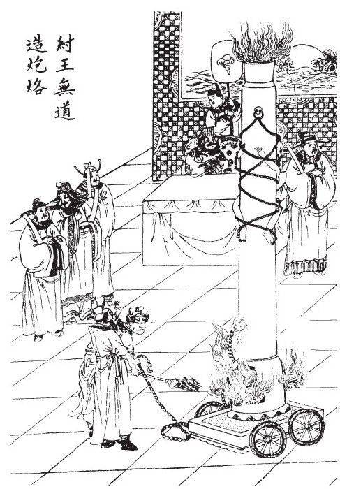 话言纣王在宫欢乐,朝政荒乱。不一日,监造炮烙官启奏功完。纣王大悦,问妲己曰:“铜柱造完,如何处置?”妲己命取来过目。监造官将炮烙铜柱推来:黄邓邓的高二丈,圆八尺,三层火门,下有二滚盘,推动好行。纣王观之,指妲己而笑曰:“美人神传秘授奇法,真治世之宝!待朕明日临朝,先将梅伯炮烙殿前,使百官知惧,自不敢阻挠新法,章牍烦扰。”一宿不题。次日,纣王设朝,钟鼓齐鸣,聚两班文武朝贺已毕。武成王黄飞虎见殿东二十根大铜柱,不知此物新设何用。王曰:“传旨把梅伯拿出!”执殿官去拿梅伯。纣王命把炮烙铜柱推来,将三层火门用炭架起,又用巨扇扇那炭火,把一根铜柱火烧的通红。众官不知其故。午门官启奏:“梅伯已至午门。”王曰:“拿来!”两班文武看梅伯垢面蓬头,身穿缟素,上殿跪下,口称:“臣梅伯参见陛下。”纣王曰:“匹夫!你看看此物是甚么东西?”梅大夫观看,不知此物,对曰:“臣不知此物。”纣王笑曰:“你只知内殿侮君,仗你利口,诬言毁骂。朕躬治此新刑,名曰‘炮烙’。匹夫!今日九间殿前炮烙你,教你筋骨成灰!使狂妄之徒,如侮谤人君者,以梅伯为例耳。”梅伯听言,大叫,骂曰:“昏君!梅伯死轻如鸿毛,有何惜哉?我梅伯官居上大夫,三朝旧臣,今得何罪,遭此惨刑?只是可怜成汤天下,丧于昏君之手,久以后将何面目见汝之先王耳!”纣王大怒,将梅伯剥去衣服,赤身将铁索绑缚其手足,抱住铜柱。可怜梅伯,大叫一声,其气已绝。只见九间殿上烙得皮肤筋骨,臭不可闻,不一时化为灰烬。可怜一片忠心,半生赤胆,直言谏君,遭此惨祸!正是: