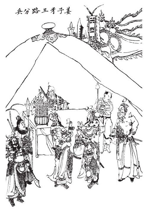 韩荣看子牙大营,尽是大红旗,心下疑惑。韩荣下城,在银安殿与众将官修本,差官往朝歌告急;一边点将上城,设守城之法。且说子牙在中军正坐,有先行官哪吒进前言曰:“兵至关下,宜当速战。师叔住兵不战,何也?”子牙曰:“不可。吾如今三路分兵:一路取佳梦关;一路取青龙关;吾自取汜水关;方免吾军左右受敌也。但督兵分取二关,非才德兼全、英雄盖世者不足以当此任。吾知非黄将军、洪将军不可。”二将至前。子牙曰:“二位可拈一阄,分为左右。”二将应喏。子牙把二阄放在桌上,只见黄飞虎拈的是青龙关,洪锦拈的是佳梦关。二将各挂红簪花,每一路分兵十万。黄飞虎的先行是邓九公;黄明、周纪、龙环、吴谦、黄飞豹、黄飞彪、黄天禄、黄天爵、黄天祥、太鸾、邓秀、赵升、孙焰红,择吉日祭旗,往青龙关去了。洪锦的先行是季康;南宫适、苏护、苏全忠、辛免、太颠、闳夭、祁恭、尹籍,分兵十万,往佳梦关去了。