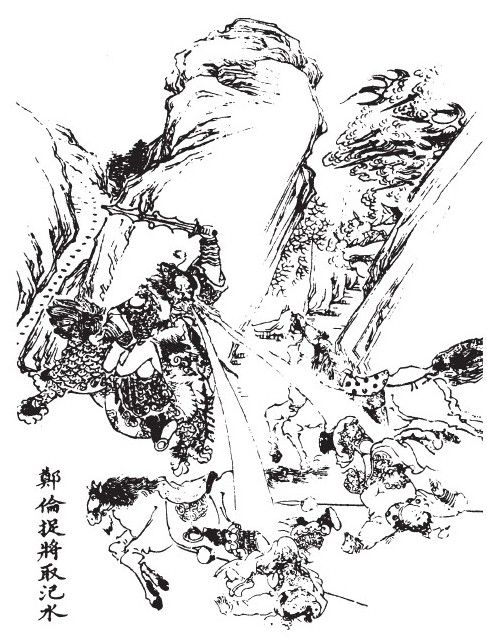 且说韩升、韩变兄弟二人,夜劫子牙行营,喊声连天,冲进辕门。子牙在中军忽听得劫营,急自上骑。左右门人俱来中军护卫。只见黑云密布,风火交加,刀刃齐下,如山崩地裂之势,灯烛难支。三千火车兵冲进辕门,如潮奔浪滚,如何抵当。况且黑夜,彼此不能相顾,只杀得血流成渠,尸骸遍野,那分别人自己。武王上了逍遥马,毛公遂、周公旦保驾前行。韩荣在阵后擂鼓,催动三军,只杀得周兵七零八落,君不能顾臣,父不能顾子。只见韩升、韩变趁势赶子牙,幸得子牙执着杏黄旗,遮护了前面一段;军士将领一拥奔走。韩升、韩变二人催着万刃车往前紧赶,把子牙赶得上天无路。直杀到天明,韩升、韩变大叫曰:“今日不捉姜尚,誓不回兵!”望前越赶,分付三千兵卒曰:“不入虎穴,安得虎子!”子牙见韩升赶至无休,看看至金鸡岭了,只见前面两杆大红旗展,子牙见是催粮官郑伦来至,其心少安。且说郑伦坐骑出山口,正迎子牙,忙问曰:“元帅为何失利?”子牙曰:“后有追兵,用的是万刃车,又有风火助威,势不可当。此是左道异术,你仔细且避其锐。”郑伦把坐下金睛兽一磕,往前迎来。只见韩升弟兄在前紧赶,三千兵随后,少离半射之地。郑伦与韩升、韩变撞个满怀。郑伦大喝曰:“好匹夫!怎敢追我元帅!”韩升曰:“你来也替不得他!”把枪摇动来刺。郑伦手中杵赴面交还。郑伦知他万刃车利害,只见后面一片风火兵刃拥来,郑伦知其所以,只一合,忙运动鼻子内两道白光,一声响,对着韩升兄弟二人哼了一声,韩升、韩变兄弟二人坐不住鞍鞒,翻下马来,被乌鸦兵生擒活捉,上了绳索。兄弟两个方睁开眼时,见已被擒捉,“呀”的一声叹曰:“天亡我也!”后面三千兵架车前进,见主将被擒,其法已解,风火兵刃,化为乌有,众兵撤回身,就跑奔回来,正遇韩荣任意赶杀周兵,看见三千兵奔回,风火兵刃全无,不见二子回来,忙问曰:“二位小将军安在?”众兵曰:“二位将军赶姜子牙至一山边,只见有一将出来,与二位将军交战,未及一合,不知怎么跌下马来,被他捉去。我等在后,不一时,风火兵刃全无,止有此车而已,只得败回,幸遇老将军,望乞定夺。”韩荣听得二子被擒,心中惶惶,不敢恋战,只得收兵进关。不表。
