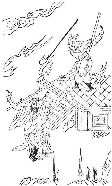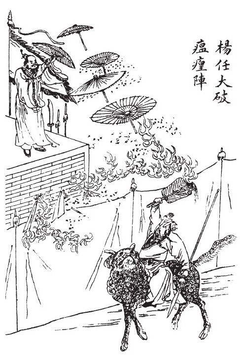 杀气漫空,悲风四起。杀气漫空,黑暗暗俱是些鬼哭神嚎;悲风四起,昏邓邓尽是那雷轰电掣。透心寒,怎禁他冷气侵人;解骨酥,难当他阴风扑面。远观似飞砂走石,近看如雾卷云腾。瘟疫气阵阵飞来,火水扇翩翩乱举。瘟阵内神仙怕,正应姜公百日灾。