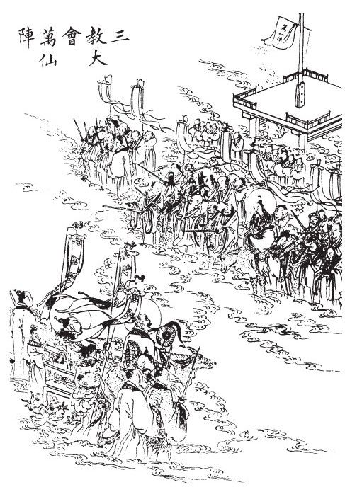且说子牙同二位真人,与诸门人弟子,前至芦篷上。但见悬花结彩,香气氤氲,迎接玉虚门下之客,今日万仙阵总会一面,满其红尘杀戒,再去返本还元。不一时这三山五岳众道人齐齐拍手大笑而来:广成子、赤精子、文殊广法天尊、普贤真人、慈航道人、清虚道德真君、太乙真人、灵宝大法师、道行天尊、惧留孙、云中子、燃灯道人,众道人见子牙稽首,曰:“今日之会,正完其一千五百年之劫数。”正是: