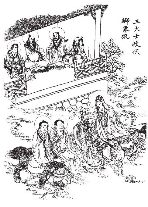 且说金光仙看见阐教内门人这等化身,自叹曰:“真好一个玉虚门下,果然气宇不同!”欲待逃回,早已被慈航道人祭起三宝玉如意,命黄巾力士:“把此物拿去篷下,听候发落。”少时,力士平空把金光仙拿至芦篷下。南极仙翁在篷下等候,忽见空中丢下金光仙来,南极仙翁见金光仙跌下篷来,遵老子命令,将金光仙颈上连拍几下:“这业障还不速现原形,更待何时!”金光仙情知不能逃脱,就地一滚,现出原形,乃是一只金毛犼。仙翁至芦篷回覆法旨。元始分付:“也与他颈上挂一牌,书金光仙名讳,就与慈航为坐骑。”仙翁一一如命施为。慈航骑了,复出阵前。此乃是三大师收伏狮、象、犼。后兴释门,成于佛教,为文殊、普贤、观音,是三位大士。此是后话,表过不题。