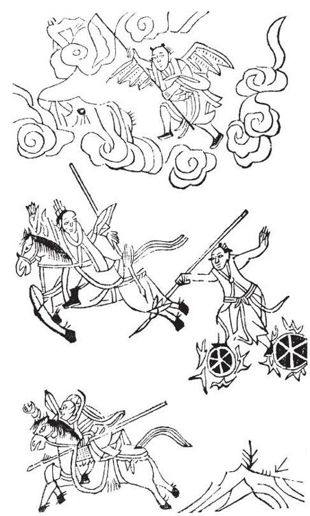 话说老子与元始冲入万仙阵内,将通天教主裹住。金灵圣母被三大士围在当中,只见三大士面分蓝、红、白,或现三首六臂,或现八首六臂,或现三首八臂,浑身上下俱有金灯、白莲、宝珠、璎珞、华光护持,金灵圣母用玉如意招架三大士多时,不觉把顶上金冠落在尘埃,将头发散了,这圣母披发大战,正战之间,遇着燃灯道人祭起定海珠打来,正中顶门。可怜!正是: